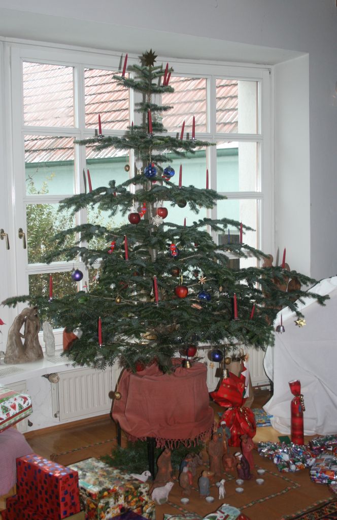Wenn er geschmückt ist, gibt es keine LEDs, sondern nur echte Wachskerzen. Und er wird heute wohl genauso aussehen.